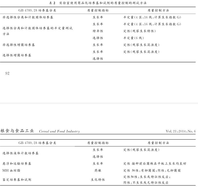 原標(biāo)準(zhǔn)GB/T4789.28一2003中并未對培養(yǎng)基和試劑的質(zhì)量要求作出具體的規(guī)定,但是在CNAS-CL09檢測和校準(zhǔn)實驗室能力認可準(zhǔn)則在微生物檢測領(lǐng)域的應(yīng)用說明中提出了實驗室應(yīng)建立和保持有效的適合試驗范圍的培養(yǎng)基(試劑)質(zhì)量控制程序.該程序應(yīng)該包括對培養(yǎng)基(試劑)進行評估的方式和儲存的規(guī)定、接受/拒收的標(biāo)準(zhǔn)等;對自備的和商業(yè)提供的培養(yǎng)基(試劑)都需要評估;根據(jù)培養(yǎng)基(試劑)的性質(zhì)和實驗類型,對培養(yǎng)基(試劑)的可用性進行評估.實驗室應(yīng)該使用符合要求的培養(yǎng)基.對微生物檢測中起關(guān)鍵作用的培養(yǎng)基必須采取技術(shù)性驗收,但是在GB4789.28--2013還未正式發(fā)布實施之前并沒有具體的標(biāo)準(zhǔn)方法和依據(jù)對培養(yǎng)基進行有效的質(zhì)量控制和評價.對培養(yǎng)基進行有效的質(zhì)量控制和評價,從而保證實驗室結(jié)果的可靠性和有效性是微生物學(xué)實驗室質(zhì)量控制程序的一個必要組成部分,新標(biāo)準(zhǔn)GB4789.28一2013中提出了培養(yǎng)基質(zhì)量控制要求和培養(yǎng)基的性能測試方法,為培養(yǎng)基的性能測定提供了依據(jù),從根本上保證了培養(yǎng)基的質(zhì)量.筆者對新標(biāo)準(zhǔn)GB4789.28-2013進行了仔細研讀,該標(biāo)準(zhǔn)在培養(yǎng)基和試劑質(zhì)量要求部分對實驗室使用的商品化和非商品化的培養(yǎng)基均進行詳細的分類,并對每一類培養(yǎng)基和試劑的微生物學(xué)要求和性能測試方法作出了詳細規(guī)定.實驗室使用的培養(yǎng)基的分類、質(zhì)量控制指標(biāo)和方法詳見