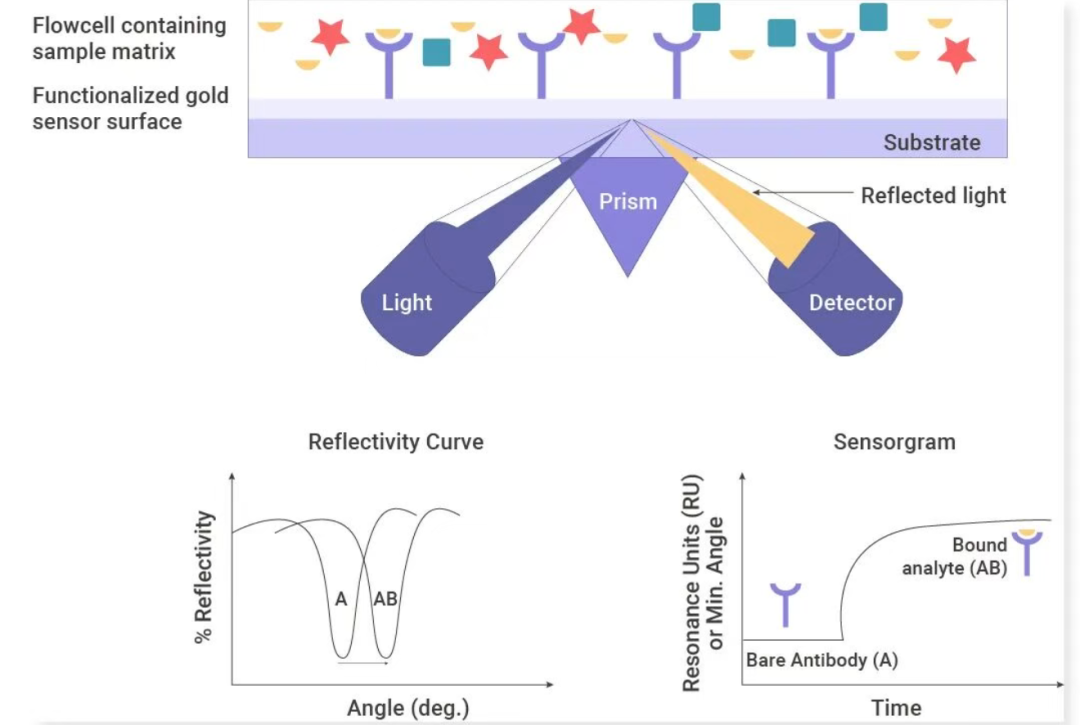 先說設備,不得不提最早應用于臨床的Biacore系列,其原理是表面等離子共振(SPR),即將一種蛋白固定于芯片表面,使另一種蛋白(分析目標)流過芯片,此時結合和解離過程會引起芯片表面折射率的改變,從而實時監測結合和解離的速率。