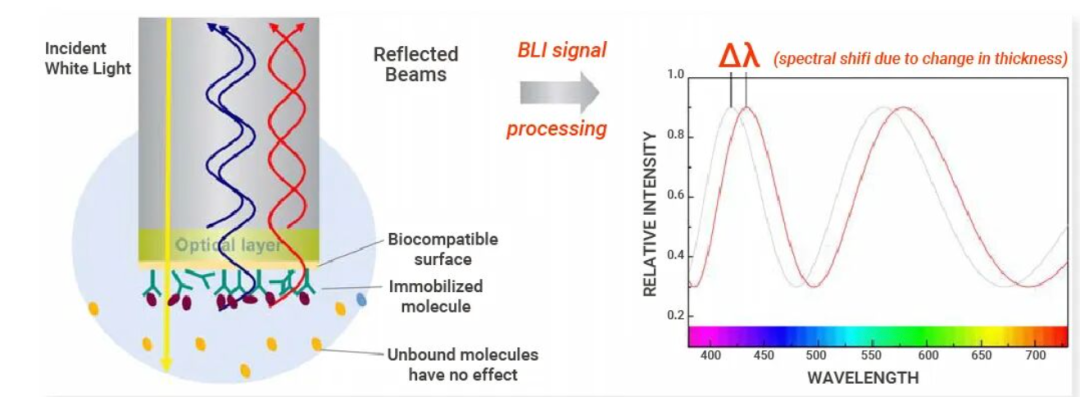 還有另外一種與SPR技術路徑類似原理的為BLI(生物薄膜干涉),也是一種光學技術。通過檢測生物分子結合到傳感器尖端引起的干涉光譜的位移,來實時監測結合和解離過程,操作更簡單,儀器更小型化。