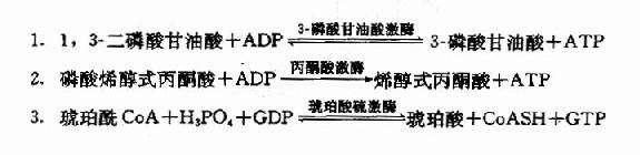 (一)底物水平磷酸化(substrate level phosphorylation) 底物分子中的能量直接以高能鍵形式轉(zhuǎn)移給ADP生成ATP,這個過程稱為底物水平磷酸化,這一磷酸化過程在胞漿和線粒體中進行,包括有: